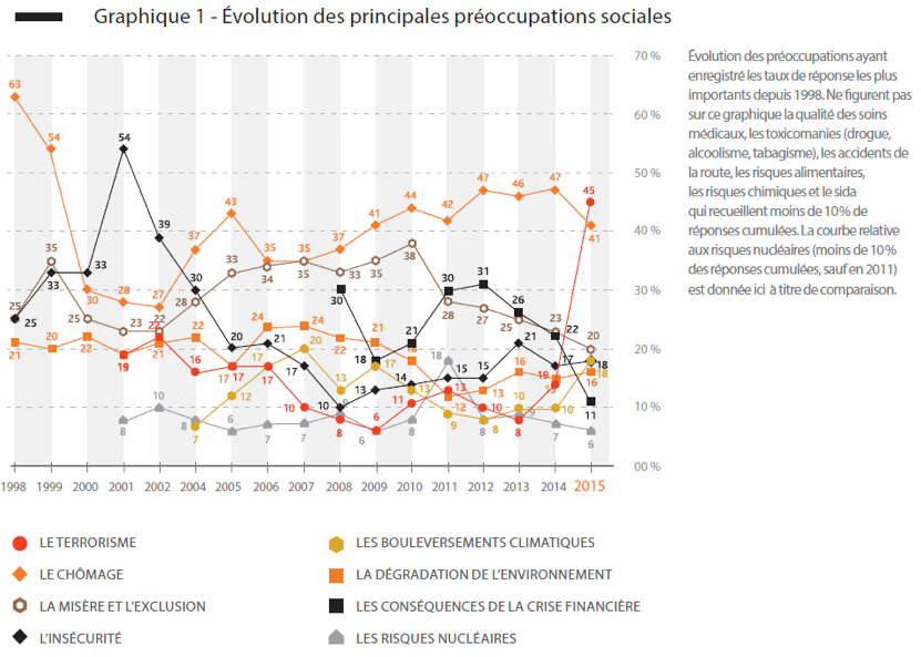 Cette montée du terrorisme comme «le problème le plus préoccupant » dans les réponses à l’enquête a pour conséquence que, pour la première fois depuis 2004, le chômage ne ressort plus comme la préoccupation première des Français, laissant cette place au terrorisme. Les préoccupations en matière de chômage reculent de 6 points mais restent élevées : elles sont mentionnées par plus de deux personnes sur cinq. Cette édition du Baromètre IRSN montre que, de manière plus générale, les préoccupations économiques tendent à refluer en face du terrorisme : de même que le chômage, les conséquences de la crise financière ainsi que la misère et l’exclusion sont moins souvent mentionnées parmi les préoccupations.
