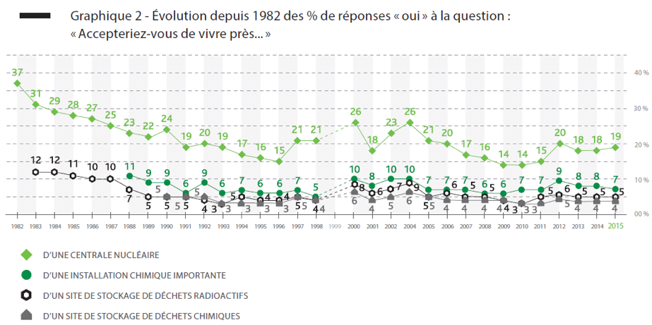 Aux yeux des Français, les centrales nucléaires demeurent les installations industrielles les plus susceptibles de provoquer un accident grave ou une catastrophe : plus de neuf Français sur dix estiment qu’un accident dans une centrale nucléaire aurait des conséquences très graves, et la majorité d’entre eux ne souhaiterait pas vivre près d’une centrale nucléaire. Les installations nucléaires font aussi redouter des risques chroniques, soit sur la santé, soit sur l’environnement : doutes sur le fait qu’à proximité des centrales nucléaires les habitants soient en aussi bonne santé et les produits agricoles aussi bons, recul également de l’idée selon laquelle « autour des centrales nucléaires, les habitants sont en aussi bonne santé qu’ailleurs ». Ainsi, depuis 1982, la proportion de Français qui accepteraient de vivre près d’une centrale nucléaire a diminué de moitié5 (voir